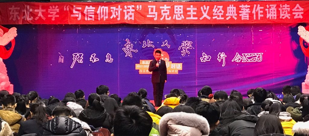 为纪念“一二·九”学生爱国运动82周年,12月6日,由东北大学团委主办的“与岁月同歌——新青春朗读会”和“与信仰对话——马克思主义经典著作诵读会”分别在南湖校区大学生活动中心和浑南校区风雨操场举行。