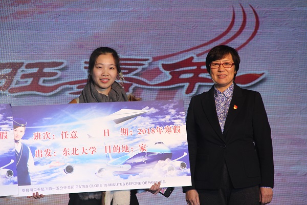 熊晓梅抽取新年大奖,并为获得幸运大奖的同学颁发寒假返家机票,为学生送去温暖的祝福。