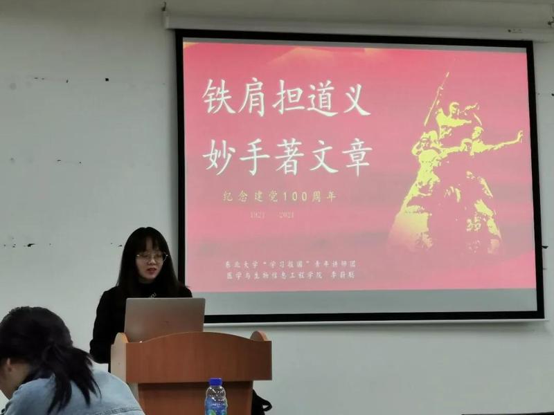 2021年4月23日18:30,东北大学“学习报国”青年宣讲团成员李蔚聪于医学与生物信息工程学院2019级团支部开展了理论宣讲活动。此次宣讲以“铁肩担道义,妙手著文章”为题,讲述了我国共产主义运动先驱李大钊先生的生平事迹,让同学们在故事中寻得青年人的那份坚定初心和责任使命。
