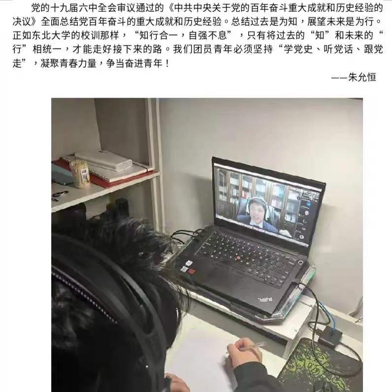 2021年12月30日,校团委举办学习贯彻党的十九届六中全会精神示范宣讲报告会,报告会以腾讯会议形式进行。马克思主义学院教师陈震受邀作题为“深刻认识三个历史决议,在百年奋斗的基础上继往开来努力奋进”的报告,校团委全体教师、各学院分团委书记、东北大学“学习报国”青年宣讲团宣讲员等一百二十余名团学干部参加报告会,报告会由宣讲团副团长李炜浩主持。