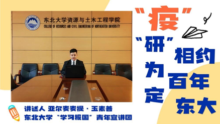 我最近在网上看到一种说法:“大学四年,我被疫情偷走了两年青春。”看到这句话时,难免会有些失落难过。但是,仔细一想这两年的时光,我在东大收获了很多珍贵的经历、记忆和成长。在这里,我有幸感受到家的温暖,母校教会了我热爱和坚守家国情怀的初心;在这里,我有幸认识一群志同道合的小伙伴,在东北大学“学习报国”青年宣讲团,我们用青年之声讲好中国故事;在这里,我有幸点燃思想的火花,在马克思主义的指引下,成为了一名光荣的预备党员,确定了未来的方向,即将完成由工科生到马理论学科研究生的转变;在这里,我有幸拥抱广阔的平台,更加坚定自己的理想信念,在一次次的挑战中成长,为今后回到家乡、建设美丽新疆做好充足准备。