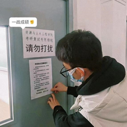 津回岁晚冰霜少,春到人间草木知。在焦灼的等待中,3月19号我终于接到了考研复试的通知。当我反复确认屏幕上的信息后,我的内心无比的激动,心想马上就能完成这一场关于梦想的马拉松。激动之余,我开始思考,复试需要良好、没有干扰的环境,该到哪里去完成复试呢?这让我一时间陷入了焦虑。徘徊间,我看到了辅导员老师在年级群里发送的消息,得知学院将为进入复试的同学,提供朝阳暖心复试间,并安排志愿者确保复试顺利进行。是的,你可以永远相信学校!在老师和志愿者的帮助下,复试当天一切顺利,我也答出了一份满意的答卷,终于一战成硕、圆梦东大马院!
