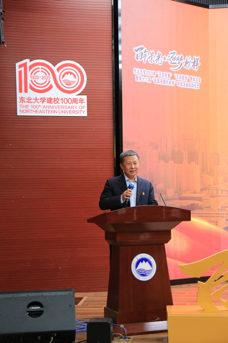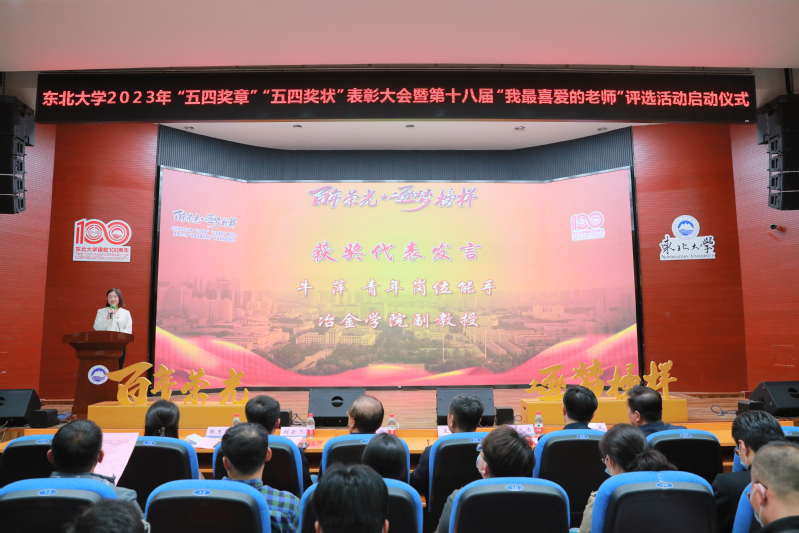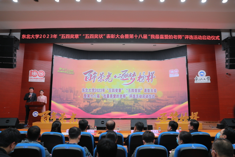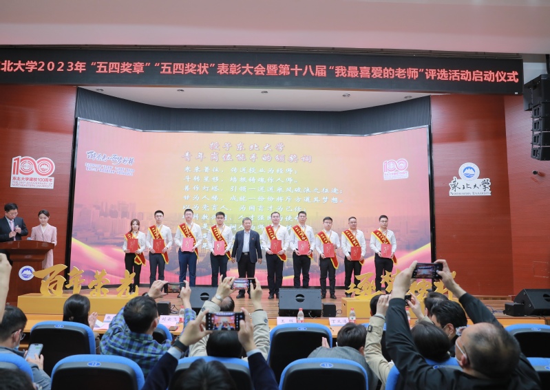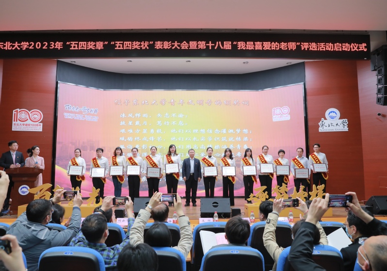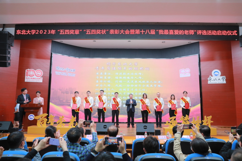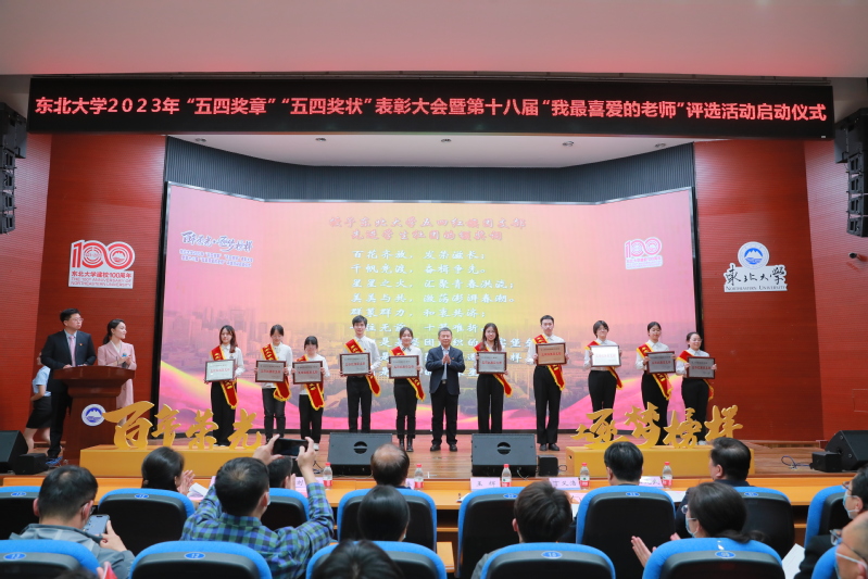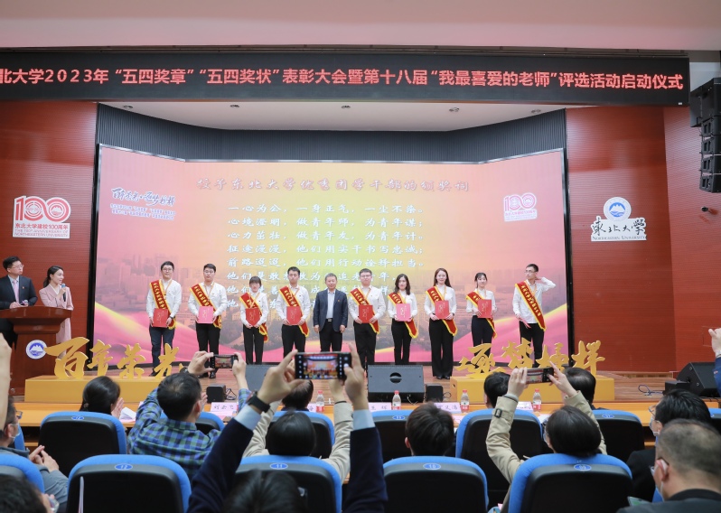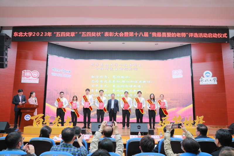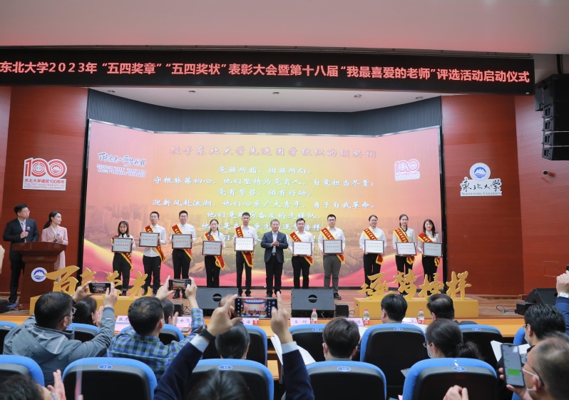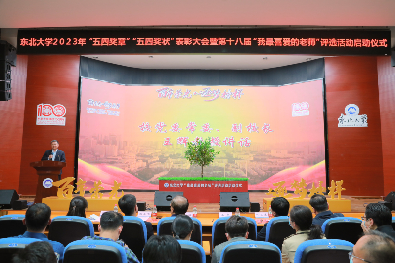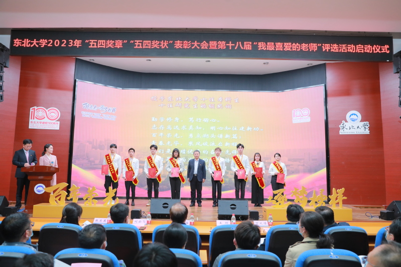 4月24日晚,东北大学2023年“五四奖章”“五四奖状”表彰大会暨第十八届“我最喜爱的老师”评选活动启动仪式在南湖校区科学馆建龙学术报告厅举行。大会表彰了全校获得“五四奖章”的50名优秀个人和获得“五四奖状”的43个先进集体。校党委常委、副校长王辉出席大会并为获奖集体和个人颁奖。研究生院、学生指导服务中心、团委、各学院相关负责人,“我最喜爱的老师”代表和青年学生代表300余人参加大会。