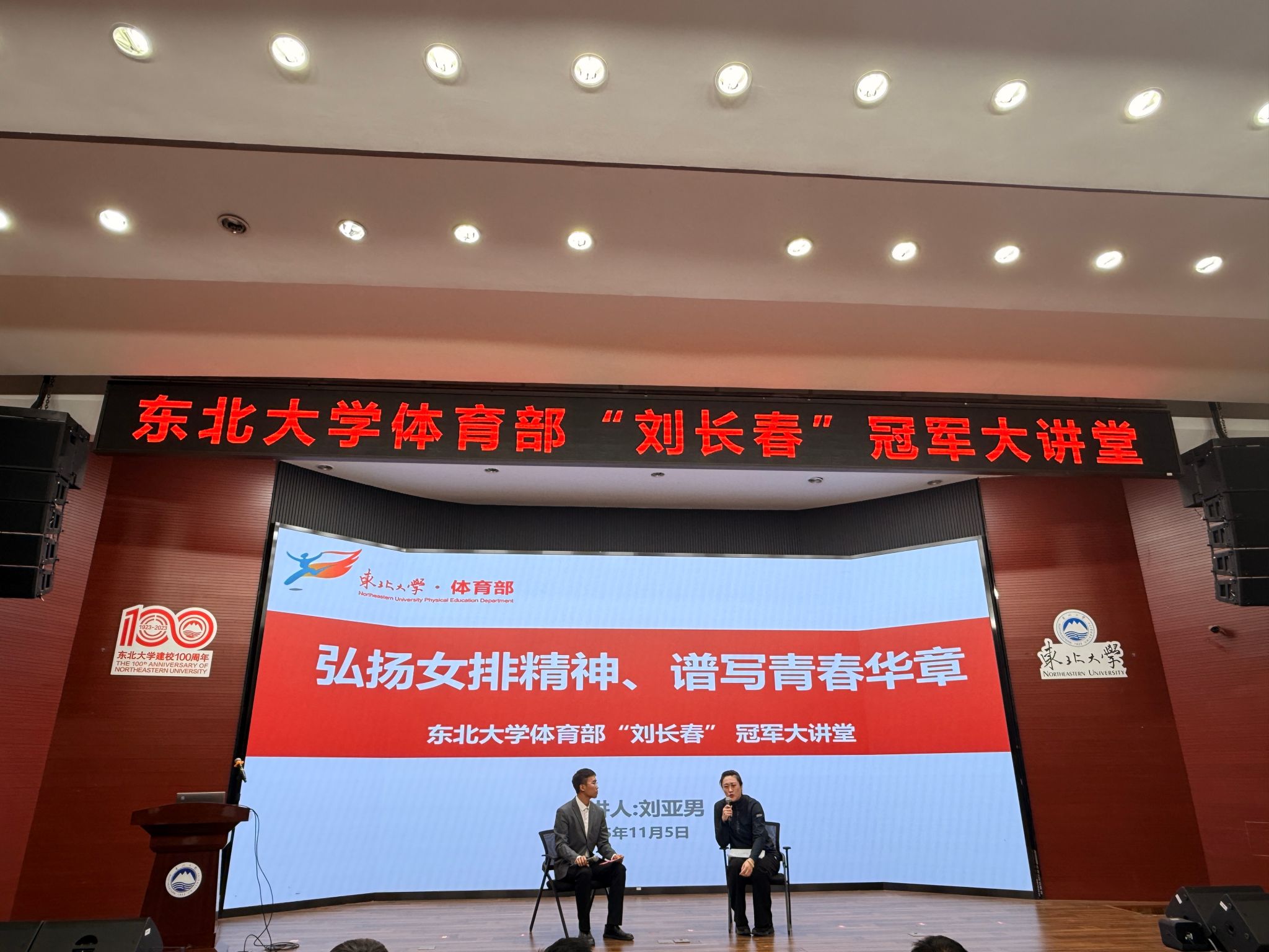 11月5日下午,东北大学体育部“刘长春”冠军大讲堂在科学馆建龙报告厅举行。本次活动以“弘扬女排精神、谱写青春华章”为主题,特邀中国女排奥运冠军刘亚男作为主讲嘉宾,与现场300余名师生共话女排精神的时代内涵与青春传承。