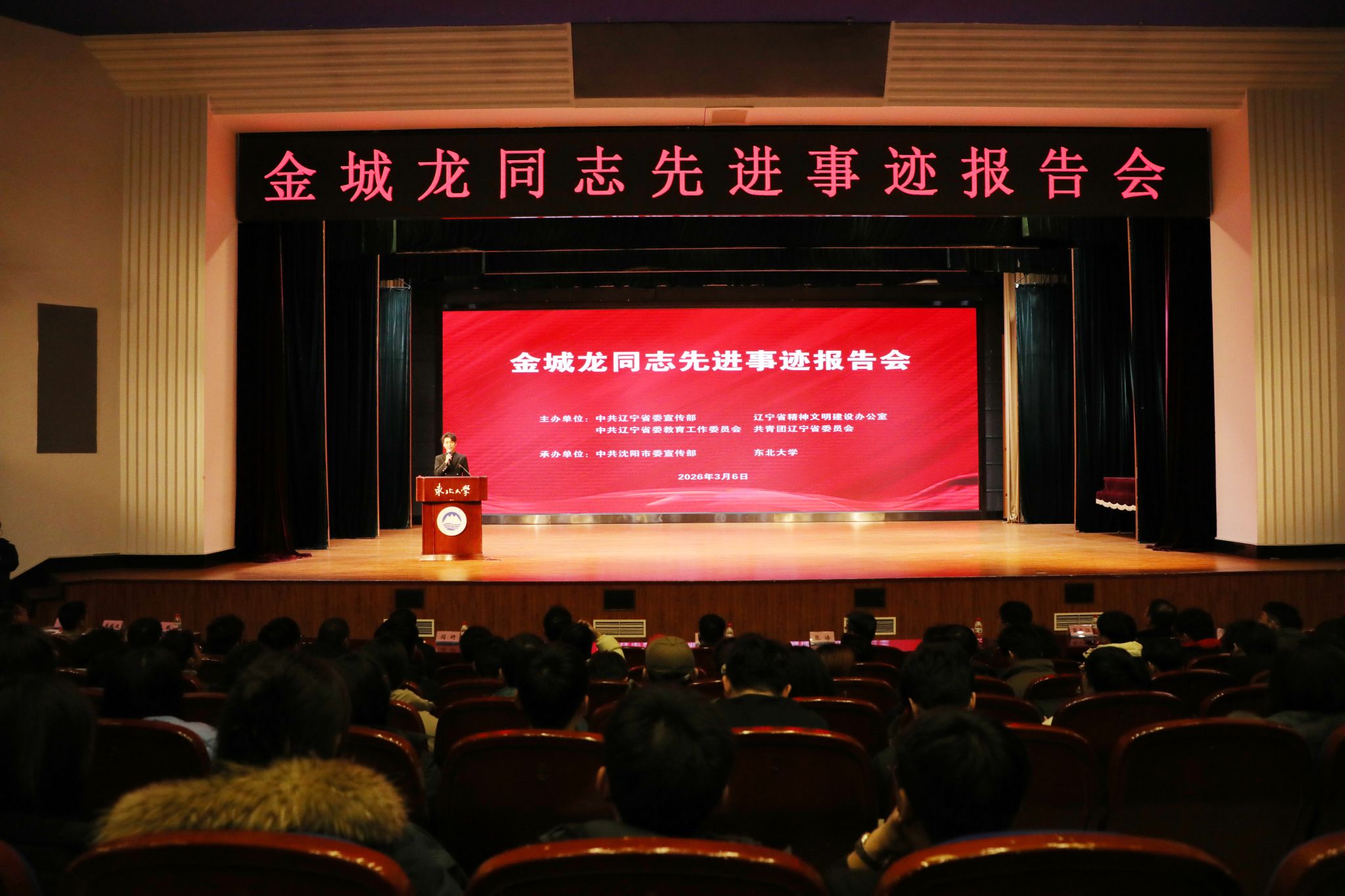3月6日,由中共辽宁省委宣传部、辽宁省精神文明建设办公室、中共辽宁省委教育工委、共青团辽宁省委员会主办,中共沈阳市委宣传部和东北大学承办的金城龙同志先进事迹报告会在东北大学汉卿会堂蔡冠深报告厅举行。辽宁省委宣传部宣传教育处处长、一级调研员袁希名,沈阳市委宣传部副部长王明鑫、宣传教育处副处长薛千江,东北大学党委副书记张皓出席活动,学校思政课教师代表、辅导员代表和近500名学生参加活动。