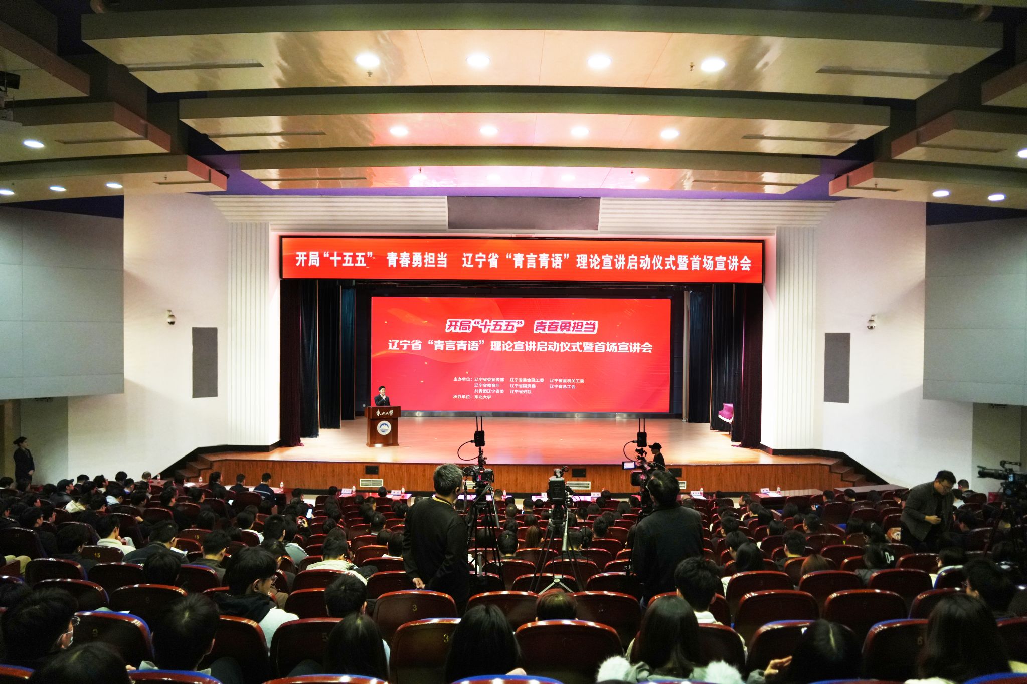 4月2日,开局“十五五”青春勇担当——辽宁省“青言青语”理论宣讲启动仪式暨首场宣讲会在东北大学汉卿会堂蔡冠深学术报告厅举行。省委宣传部副部长章瑞,省委金融工委专职副书记于国强,省直机关工委副书记李雁,省教育厅二级巡视员程万恩,省国资委二级巡视员郑志刚,省总工会党组成员、经审会主任许忠,团省委副书记崔洪奎,省妇联党组成员、副主席吴文彩,东北大学党委常委、副校长王辉出席活动。各市委宣传部、省沈抚改革创新示范区党工委党建工作部分管领导、业务部门负责同志,东北大学相关部门负责同志,以及“青言青语”理论宣讲示范宣讲团队成员,东北大学师生代表近500人参加活动。