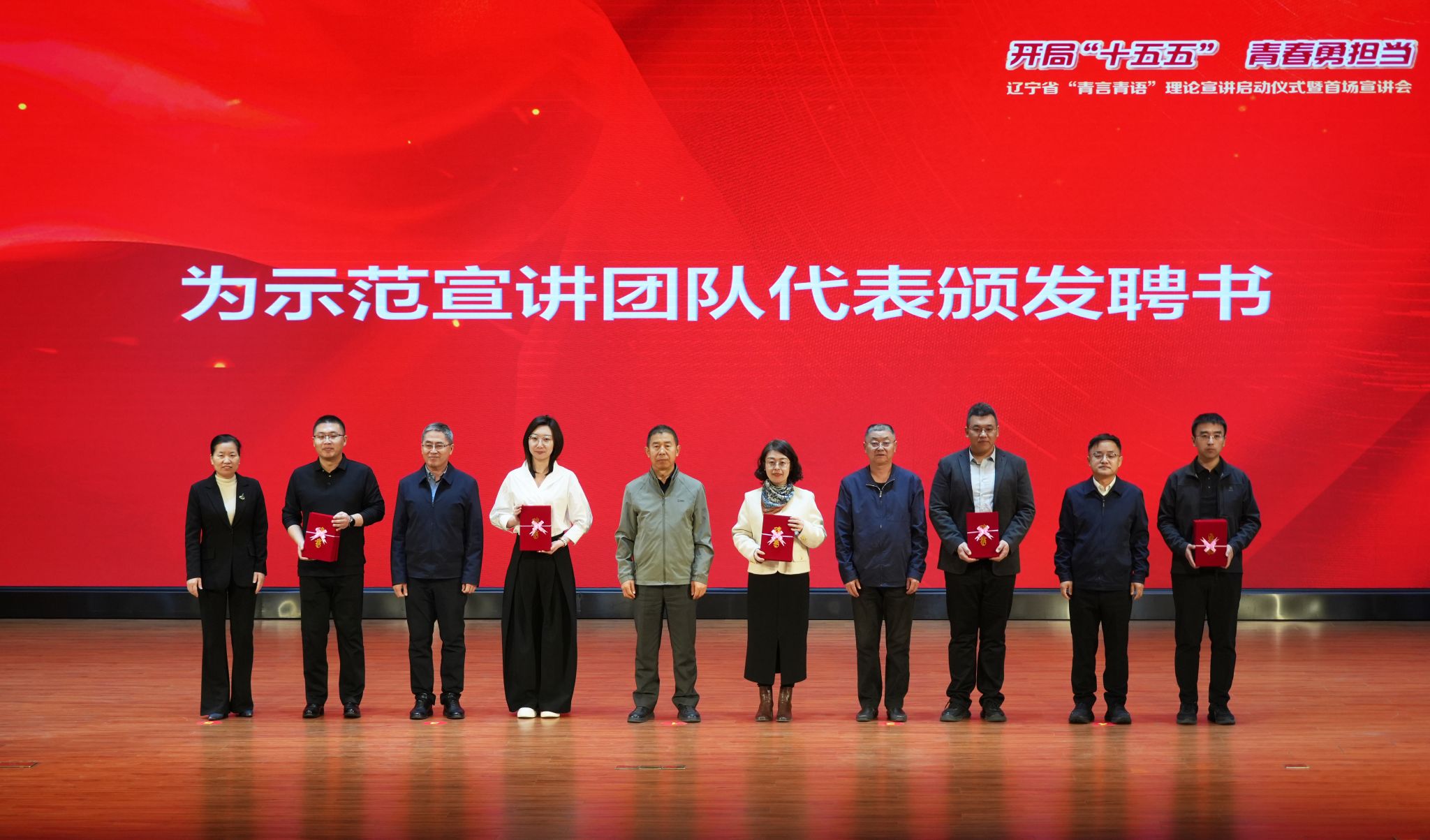 启动仪式上,章瑞、于国强、李雁为“青年先锋”宣讲团、“硕博知行”宣讲团、“基层名嘴”宣讲团授旗。程万恩、郑志刚、任许忠、崔洪奎、吴文彩为宣讲团成员代表颁发聘书。“青年先锋”宣讲团成员陶姝宇代表辽宁省“青言青语”理论宣讲示范团队作表态发言。