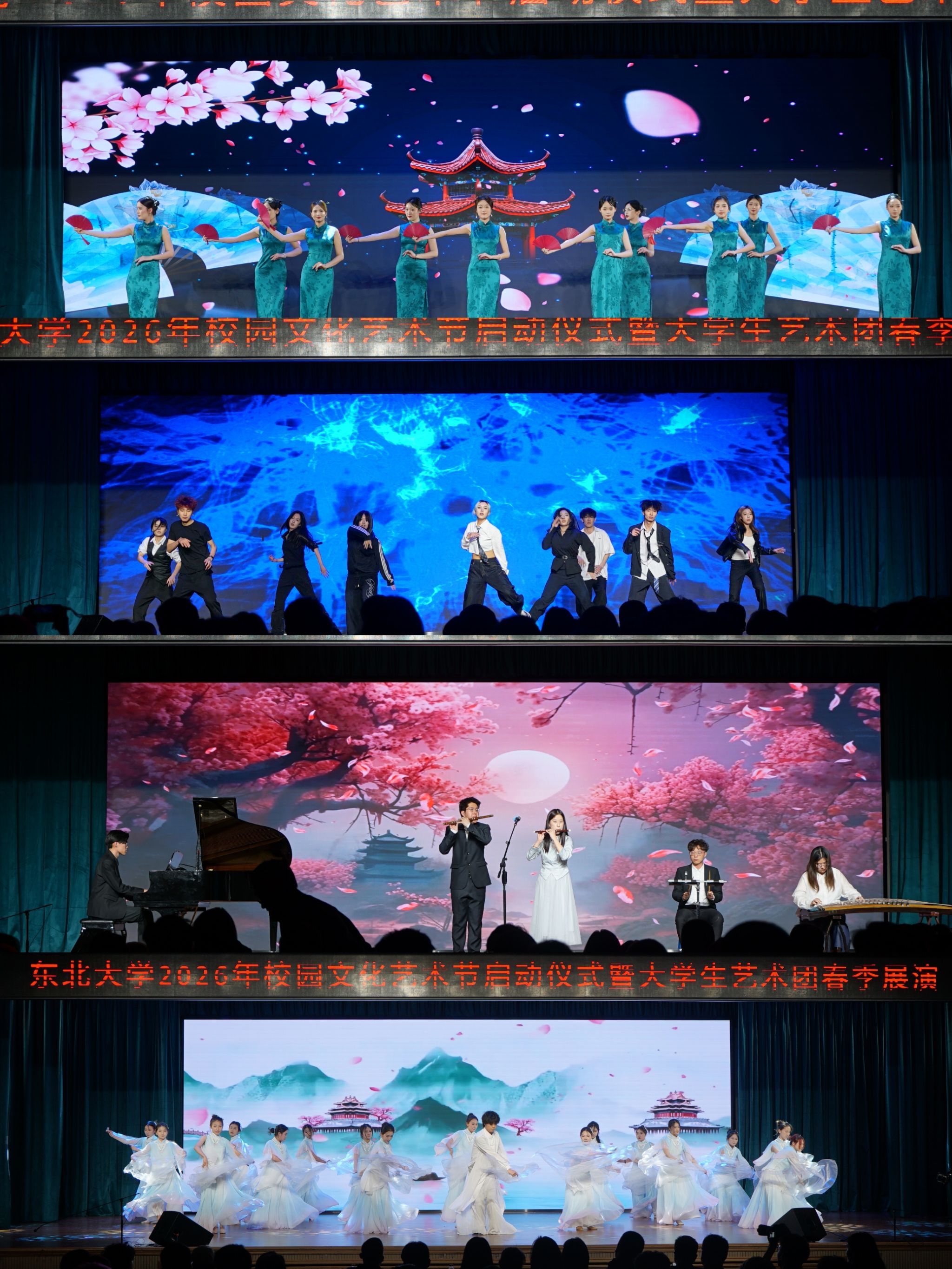 4月22日,东北大学2026年校园文化艺术节启动仪式暨大学生艺术团春季展演在南湖校区学生活动中心多功能厅举行。校院两级专职团干部、大学生艺术团指导教师参加活动,300余名艺术团成员参与展演,400余名师生观看。